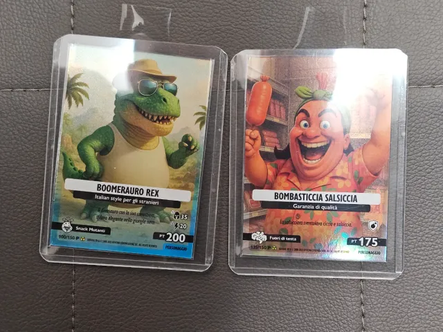 Vendo 2 carte Brainrot. - Boomerauro Rex, Italian style per gli stranieri. - Bombasticcia Salsiccia, Garanzia di qualità.
