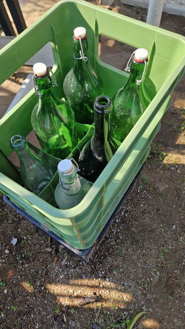 2 cassette con bottiglioni e bottiglie assortite