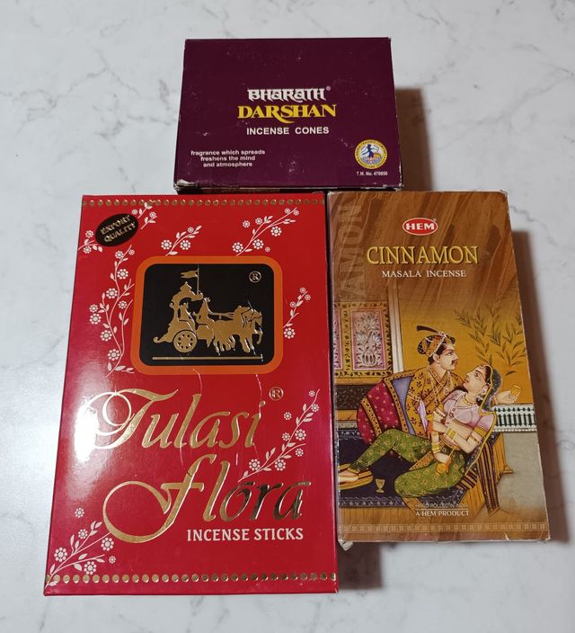 Dettagli del prodottoUna confezione di incenso floreale TULASI Flora con 12 confezioni da 25 grammi; una confezione incenso Hem Cinnamon con 12 pacchetti contenenti 12 bastoncini cadauno; una confezione di inceno a coni Darshan con 12 confezioni da 10 coni.