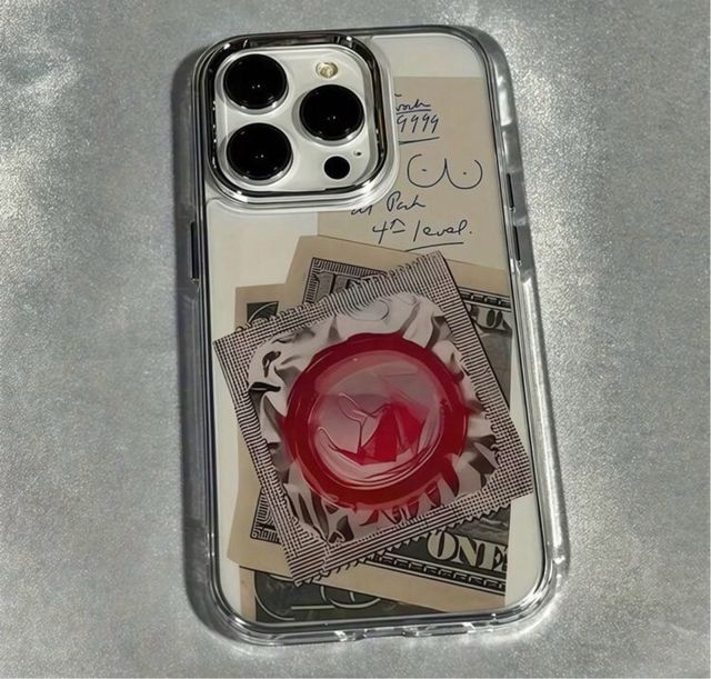 Cover per iPhone 16 Plus con un design unico. - Stampa con motivo di banconote e preservativo. - Materiale trasparente.