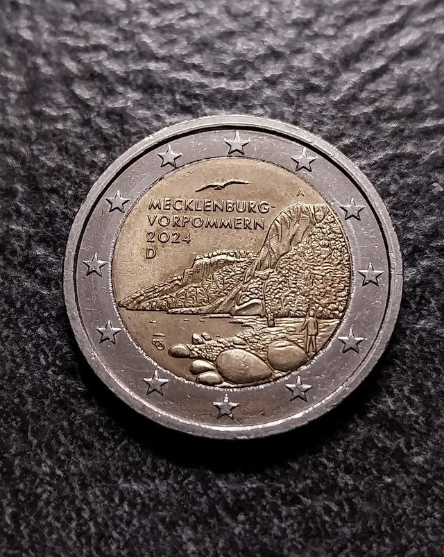 Dettagli del prodottoCommemorativa dedicata al Land del Meclemburgo-Pomerania Anteriore. Il disegno raffigura il Parco Nazionale di Jasmund, con le famose scogliere di gesso. (n2179)