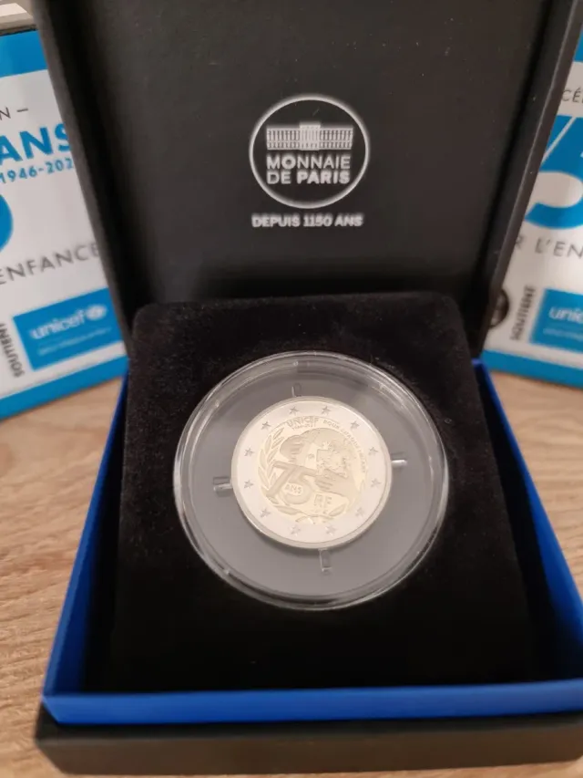 Dettagli del prodottoMoneta commemorativa da 2 Euro Proof della Francia, dedicata al 75° anniversario dell'UNICEF.