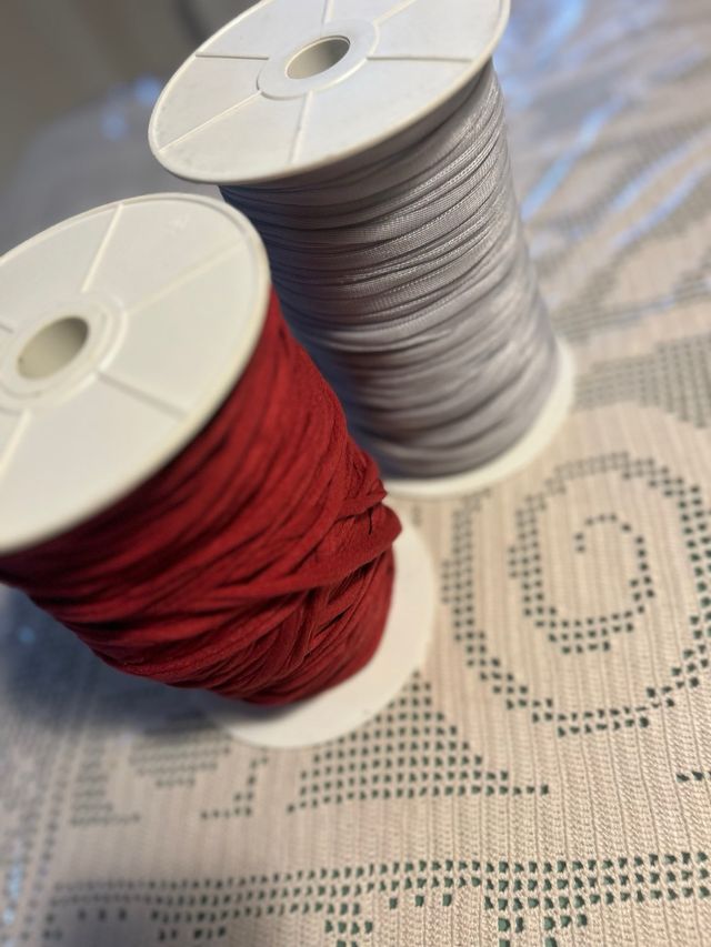 Dettagli del prodottoVendo 2 gomitoli di fettuccia per uncinetto, uno rosso e uno grigio.