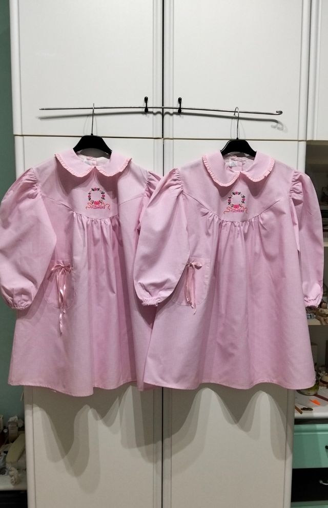 Dettagli del prodottoBellissimi grembiuli per asilo, perfetti per una bambina di 6 anni. Sono due, rosa a quadri, con colletto e ricamo floreale. - Perfetti per la scuola materna