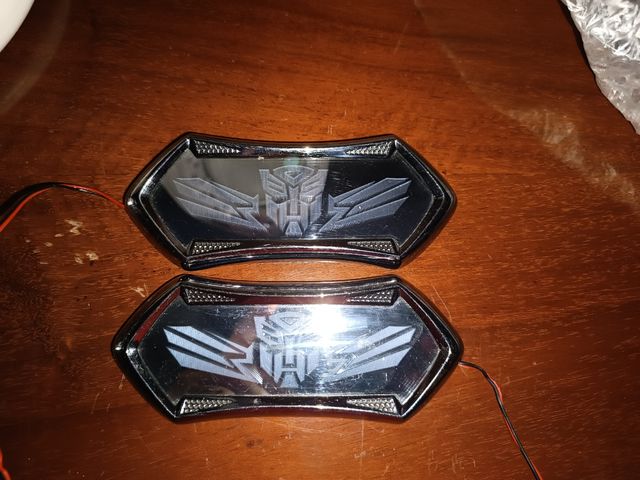 Dettagli del prodottoVendo due luci a LED a forma di stemma dei Transformers. Sono in abs cromato, con finitura lucida e riflettente.