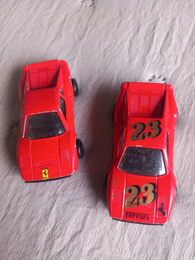Due macchinine Majorette, modelli Ferrari GTO, risalenti agli anni '80-'90. - Colore rosso. - Dettagli con numero 23 dorato e logo Ferrari.