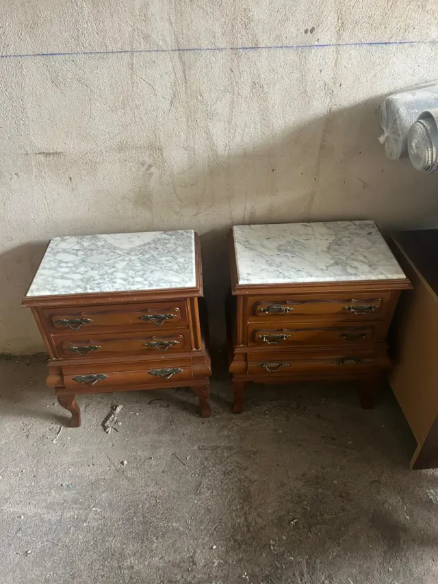 Dettagli del prodottoCoppia di comodini in legno con piano in marmo. Design classico ed elegante. Tre cassetti con maniglie. Gambe intagliate. La descrizione è stata tradotta automaticamente.Misure del prodotto