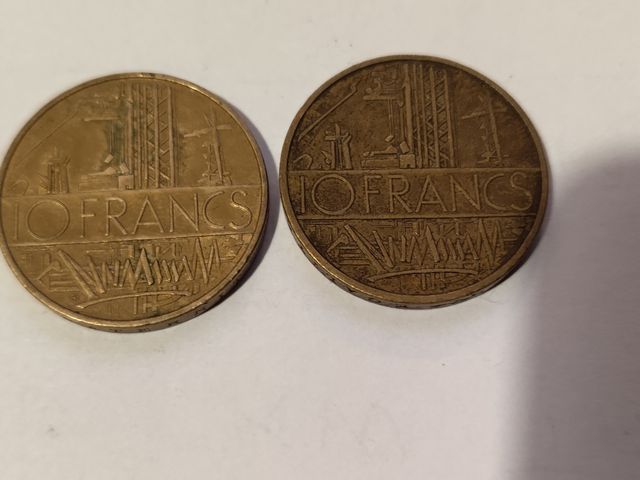 Dettagli del prodottoDue monete da 10 Franchi Francesi, una coniata nel 1975 e l'altra nel 1979. Rappresentano un ponte e delle strutture industriali.