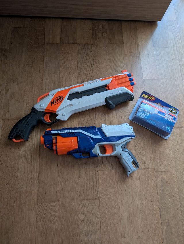 Vendo due pistole Nerf, una Roughcut 2X4 con 6 proiettili e una Disruptor, con 6 proiettili, insieme a una confezione di 30 proiettili. - Nerf Roughcut 2X4 - Nerf Disruptor - 30 proiettili Nerf