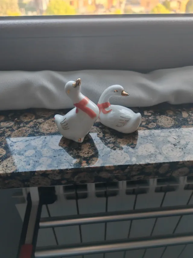 Set di due oche decorative in ceramica, perfette per impreziosire qualsiasi ambiente. - Oche bianche con dettagli dorati. - Fiocco rosso sul collo.