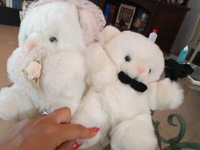 Dettagli del prodottoDue teneri peluche a forma di orsetto, vestiti da sposi. Perfetti per decorare una cameretta o come regalo. - Sono morbidissimi e bianchi. - L'orsetto 'sposa' indossa un velo e tiene un fiorellino rosa. - L'orsetto 'sposo' sfoggia un papillon nero.
