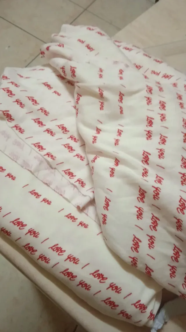 Due pezzi di tessuto vintage con una stampa ripetuta della scritta love you in rosso. - Motivo love you su sfondo bianco. - Ideale per progetti creativi.