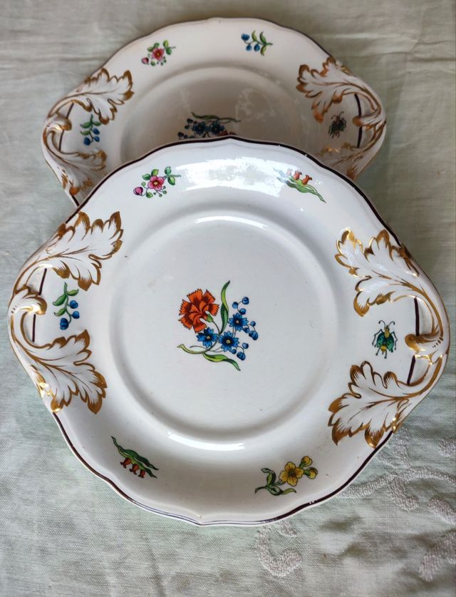 Manici elaborati e dorati a mano, decoro floreale brillante e colorato. Ottimo stato, naturalmente sono 2 oggetti antichi ma non hanno sbeccature né capelli né danni visibili, guardate le foto.