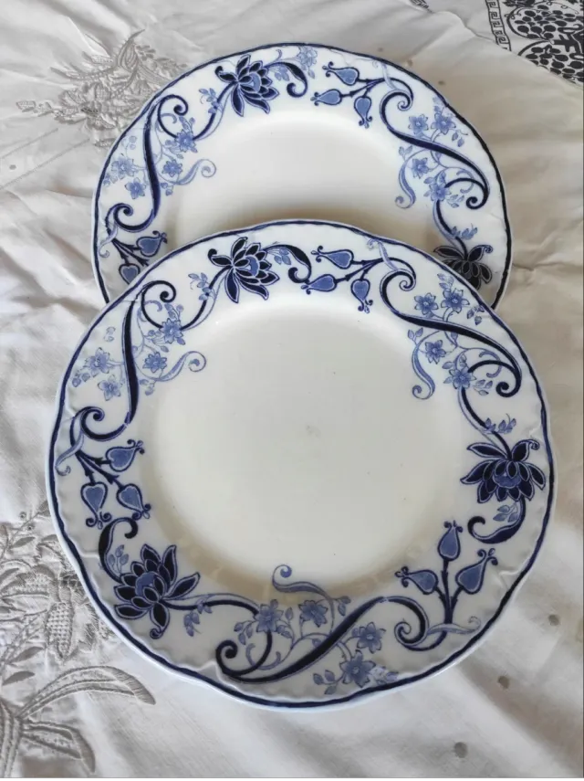 Dettagli del prodottoCoppia di piatti Società Ceramica Richard epoca Liberty, inizio 1900, in ceramica con decoro stile Art Nouveau blu e bianco.