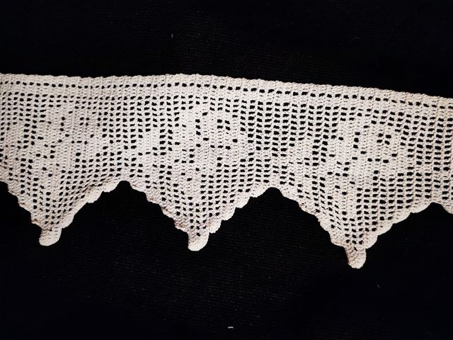 2 Pizzi a filet con rose, manifattura artigiana, ogni striscia ha nove punte e misura cm. 91 x 11 h.