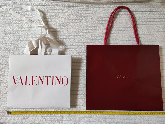 2 pz buste di carta, di cui una bianca di Valentino e una rossa di Cartier.