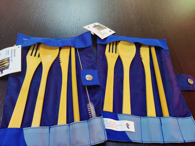 2 set di posate in Bamboo con cannuccia (in un set manca lo spazzolino per lavare la cannuccia) con relativi astucci in tela Nuovi con etichetta
