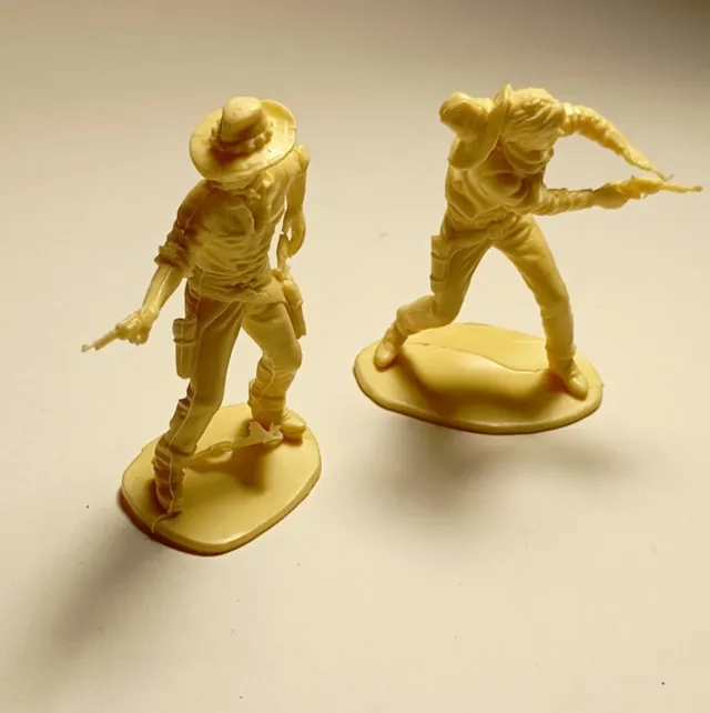 Due soldatini in plastica, raffiguranti personaggi western. Colore panna misura cm. 5: e cm. 6 altezza