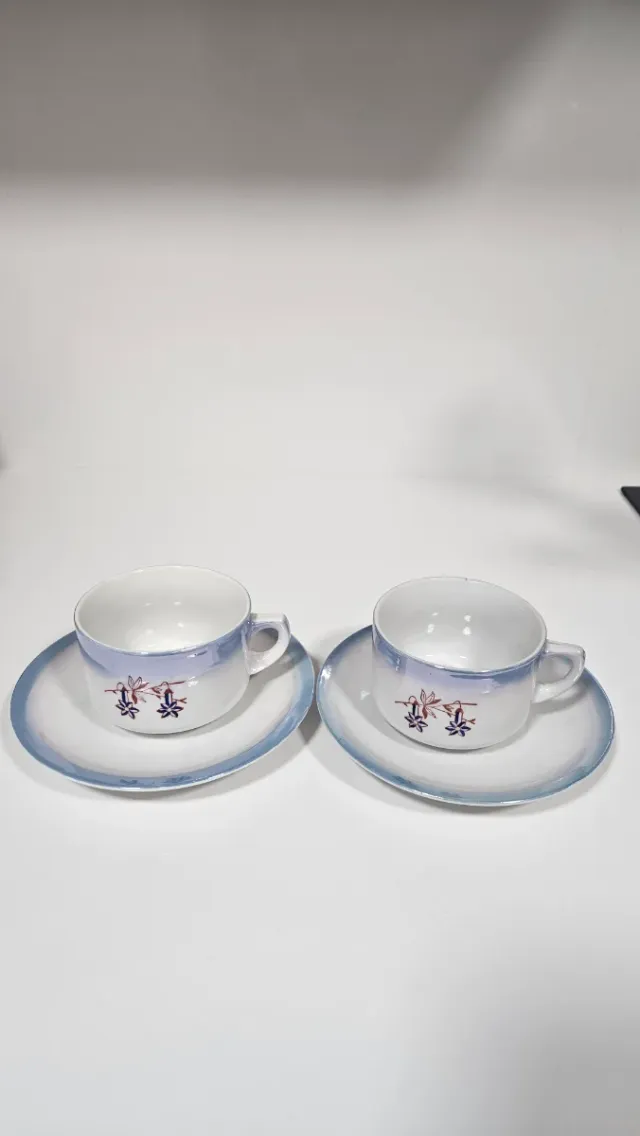 Dettagli del prodottoSplendido set di due tazze con piattini abbinati, con un design antico ed elegante. - Tazze e piattini in ceramica. - Decorazione floreale in toni blu e rossi. - Bordo azzurro chiaro su tazze e piattini. La descrizione è stata tradotta automaticamente.