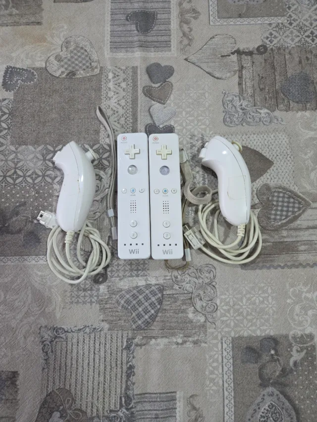 Set completo di due telecomandi Wii bianchi e due controller Nunchuk. - Due telecomandi Wii bianchi. - Due controller Nunchuk bianchi.