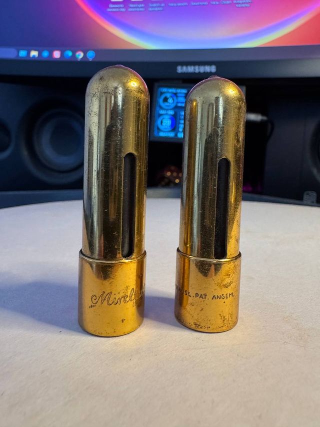 Dettagli del prodottoSet di due vaporizzatori per profumo vintage Mirelli, realizzati in metallo dorato. Un pezzo d'epoca per la tua collezione.