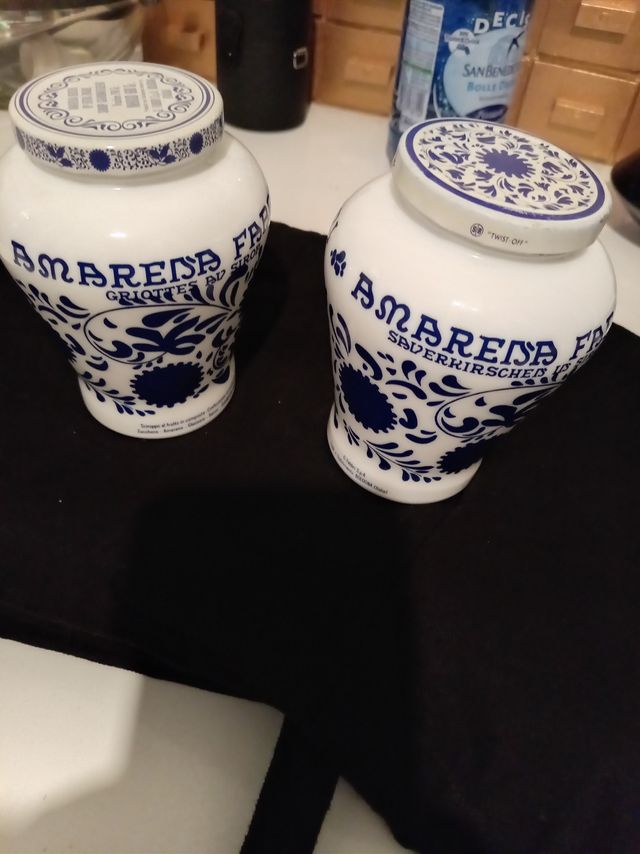 Vendo 2 vasetti di Amarena Fabbri. - Vaso in ceramica bianca con decorazioni blu. - Ideali per collezionismo o come contenitori decorativi.