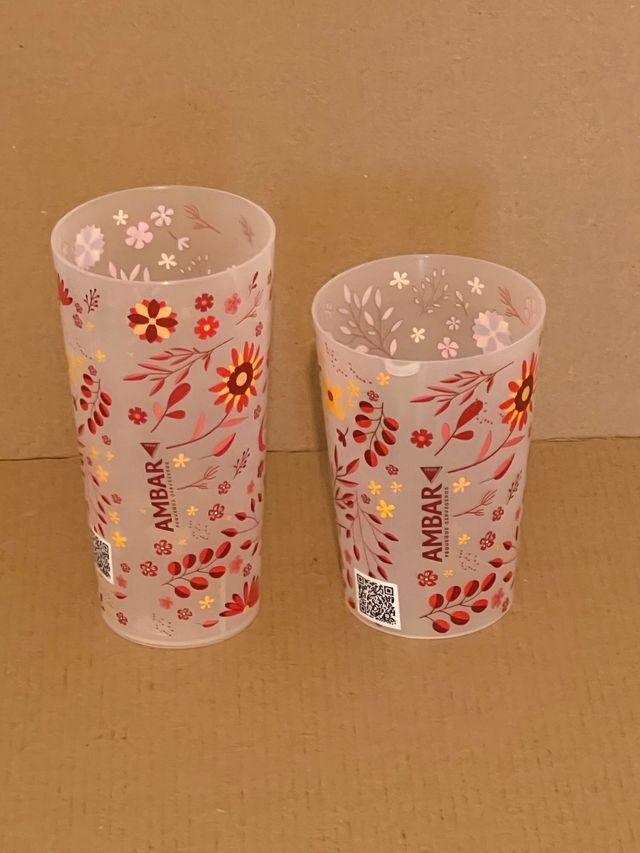 Dettagli del prodottoSet di due bicchieri di birra del marchio Ambar, modello Epsilon, con un design floreale in toni di rosso e giallo. Ogni bicchiere costa 6€, mentre il set di due costa 10€. La descrizione è stata tradotta automaticamente.
