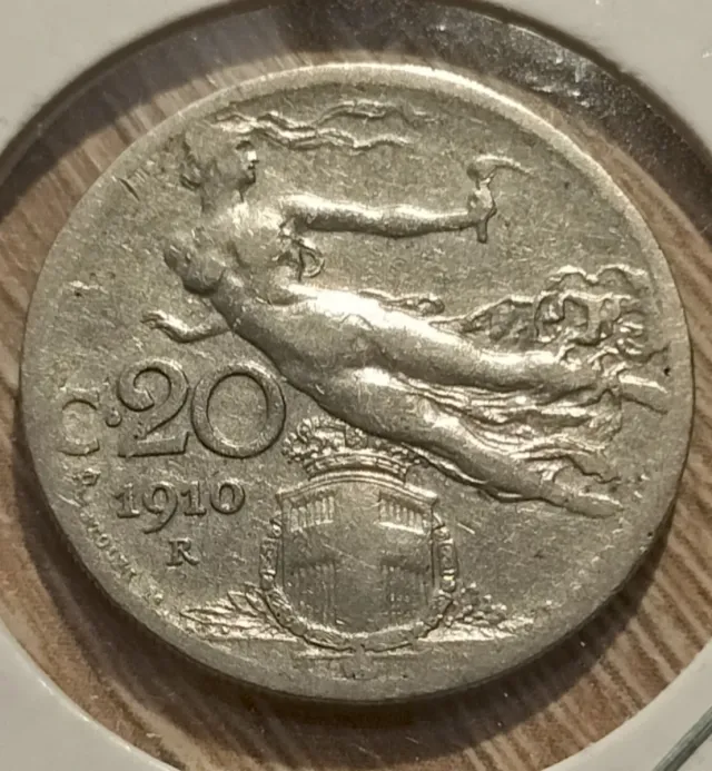 - Rovescio: Stemma sabaudo coronato, con valore 20 e anno 1910.