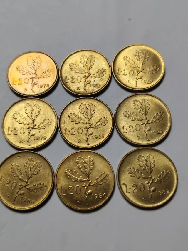 Dettagli del prodottoLotto composto da 9 monete da 20 Lire italiane, raffiguranti una quercia.