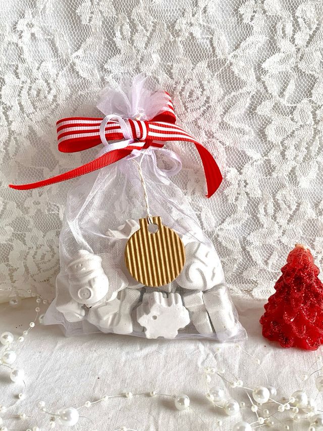 Dettagli del prodottoSacchetto in organza, con nastro rosso e bianco, contenente 25 Gessi decorativi a tema natalizio tutti diversi creati per comporre il calendario dell’avvento (nell’ultima foto un’idea di come si può realizzare)