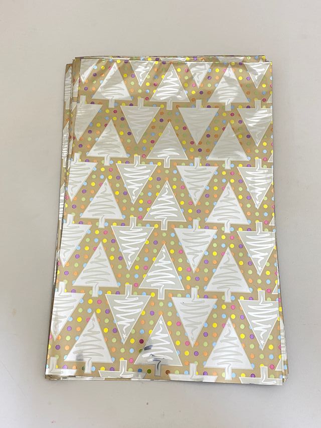 Dettagli del prodottoConfezione da 28 buste regalo per preparare pacchetti di Natale, sfondo oro con alberi di natale argento, marca Piennepi, alta qualità made in Italy, misura 25x40 cm.