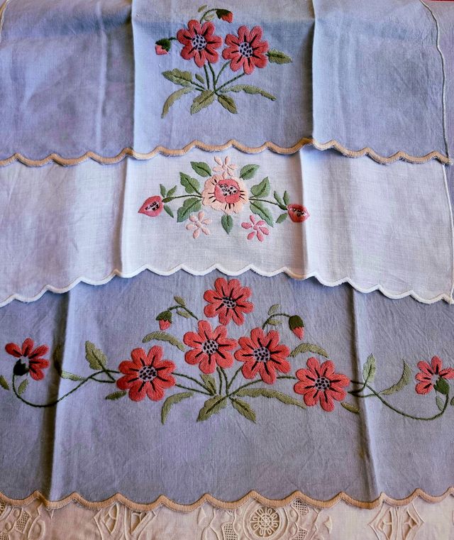 Dettagli del prodotto3 Asciugamani in puro lino con ricamo a punto pieno fatto a mano di fiori rosa antico.