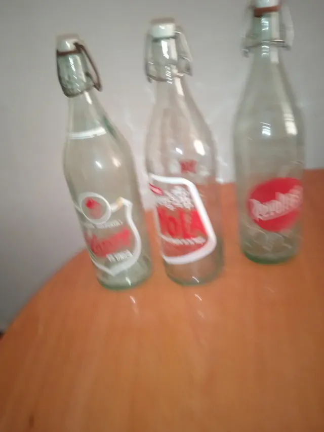 Dettagli del prodottoSet di tre antiche bottiglie in vetro con tappi meccanici. - Bottiglia con etichetta Limonata. - Bottiglia con etichetta Cola. - Bottiglia con etichetta Fanta. La descrizione è stata tradotta automaticamente.