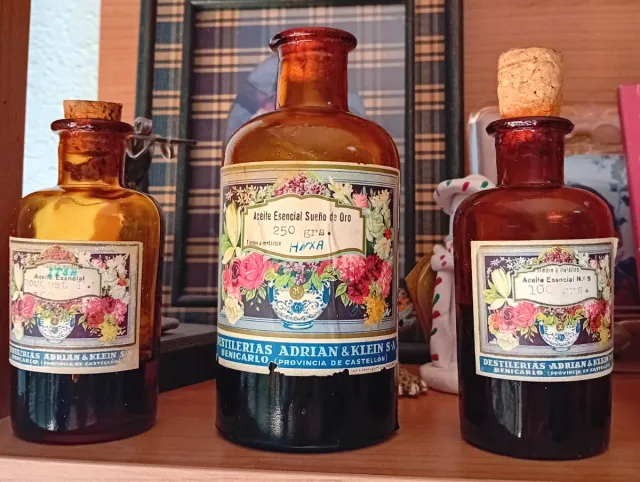 Dettagli del prodottoSet di tre antiche bottiglie in vetro ambrato per essenze profumate.