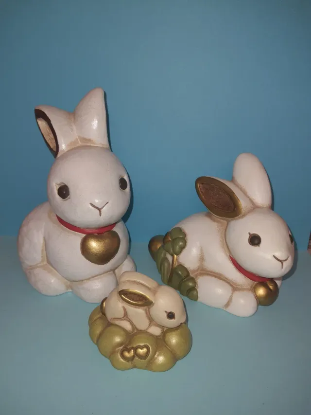 Dettagli del prodottoSet di tre adorabili conigli Thun, perfetti per collezionisti o come decorazione pasquale. Questi pezzi vintage aggiungono un tocco di dolcezza.