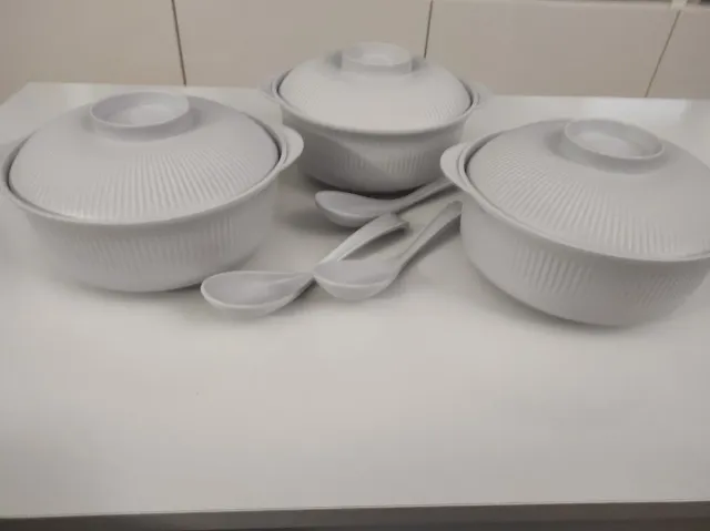 3 ciotole per zuppa cinesi con cucchiai e coperchi
