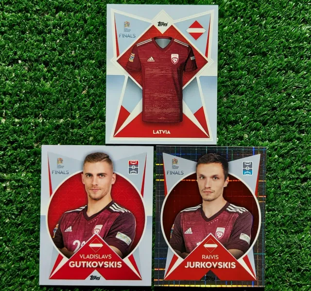 Set di 3 figurine Topps della Nations League. - Figurine di giocatori della Lettonia. - Include una figurina della maglia della Lettonia. - Modello F540.