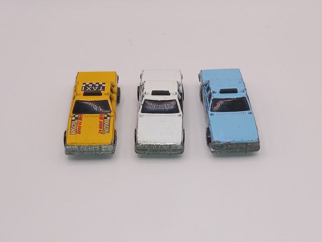 Set di tre macchinine Hot Wheels Mattel del 1983. - Una taxi gialla. - Una bianca. - Una blu.