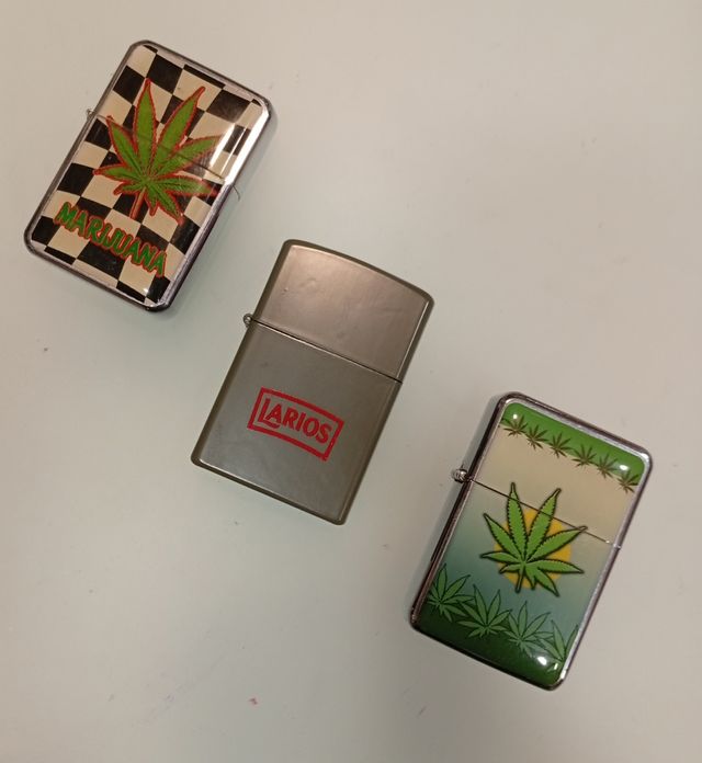 - Un accendino con motivo a scacchiera e foglia di marijuana.