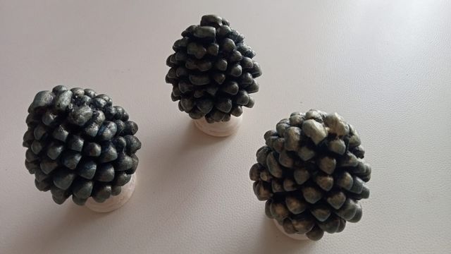 Dettagli del prodottoSet di 3 piccole pigne decorative, realizzate in resina. Sono di colore grigio-verde scuro con finitura metallizzata. Perfette come decorazioni per la casa o per completare un centrotavola.