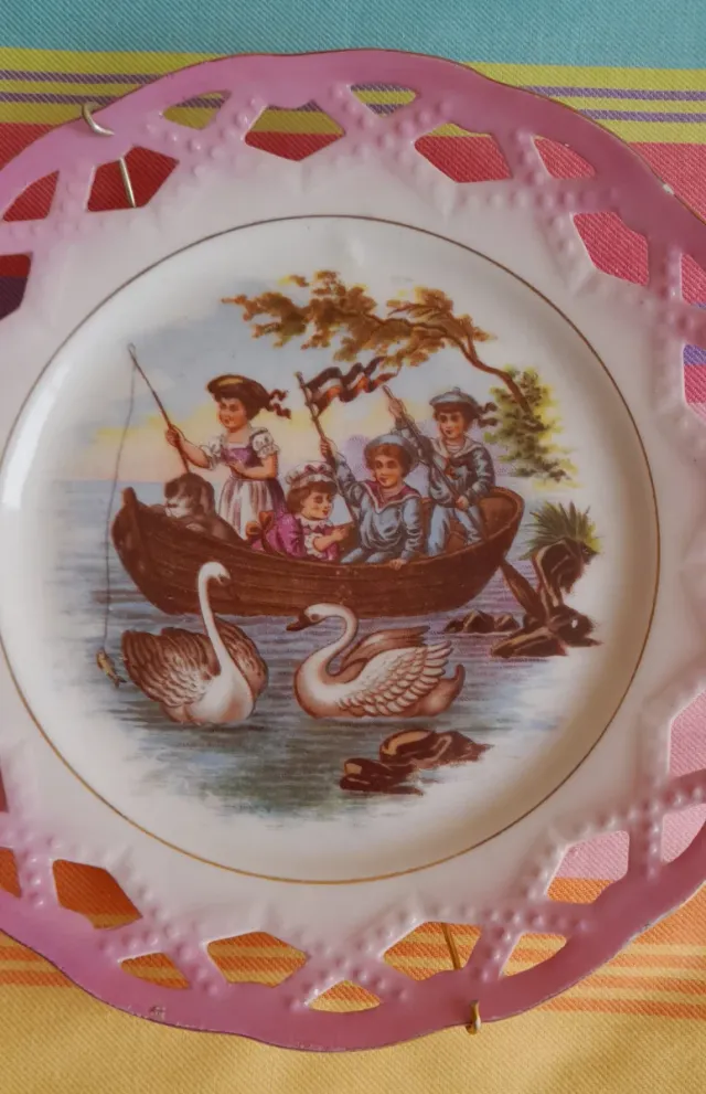 Dettagli del prodottoSet di tre antichi piatti decorativi, con un design vintage. Misurano 17 e 19 cm di diametro. - Include un piatto aggiuntivo in regalo. - Ogni piatto ha un bordo traforato in rosa, verde e blu. - La scena centrale rappresenta una barca con bambini e cigni e l'altra una dichiarazione floreale La descrizione è stata tradotta automaticamente.