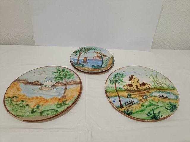 Dettagli del prodottoSet di 3 piatti decorativi in ceramica dipinti a mano con scene di paesaggi rurali e marini.