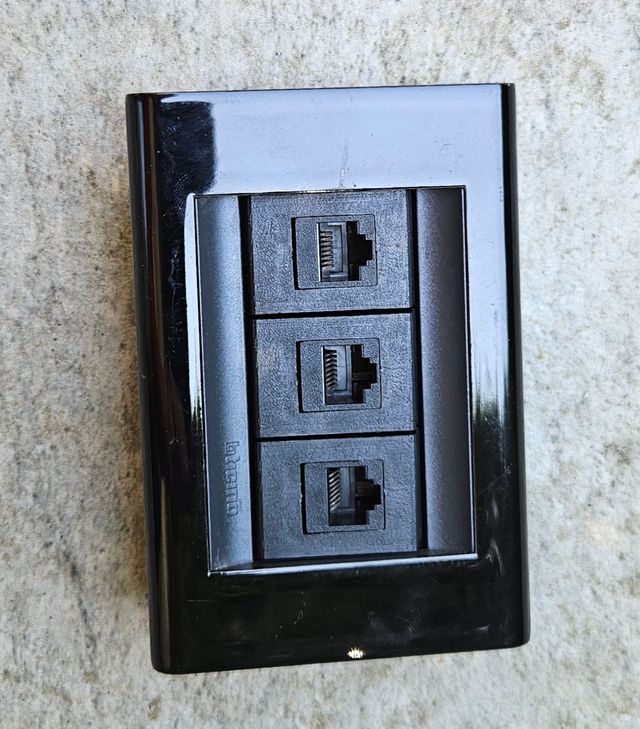 Dettagli del prodotto3 prese di rete bticino RJ45 + supporto + placca metallo nero.