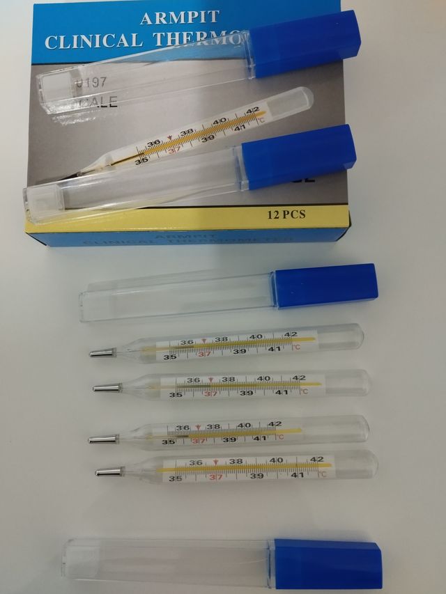 Dettagli del prodottoSet di 4 termometri in vetro, risalenti agli anni 90 ideali per misurare la temperatura corporea.Basta un minimo sforzo per azzerarli