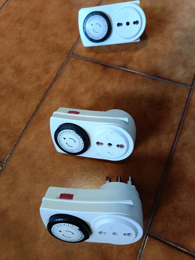 Set di tre timer giornalieri meccanici per uso interno. Ideali per programmare l'accensione e lo spegnimento di apparecchi. Tre pezzi 12€. Un pezzo 5€.