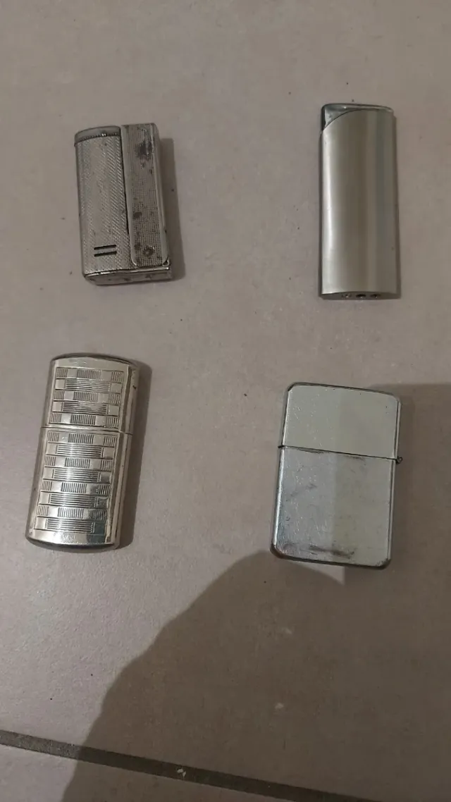 Dettagli del prodottoSet di quattro accendini da collezione, realizzati in metallo con finiture argentate.