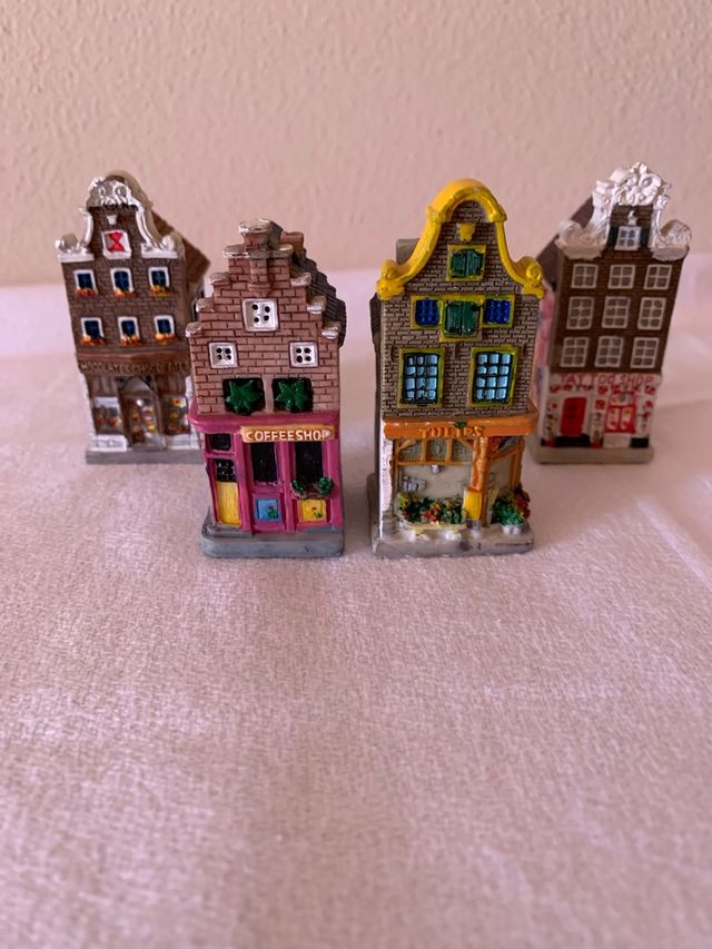 Dettagli del prodottoSet di quattro casette in miniatura decorate in stile nordico. Perfette per collezionisti o come elementi decorativi.