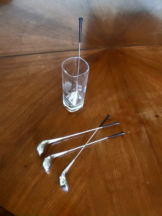 Dettagli del prodottoSet di 4 originali drink cooler, mini mazze da golf in silverplate refrigeranti per drink e cocktail. Vintage, anni '70. Prodotti da Frigast, Danimarca. Le mazze vanno prerefrigerate e inserite nel bicchiere. Ottime condizioni. 22 cm circa. Vedi foto per dettagli.