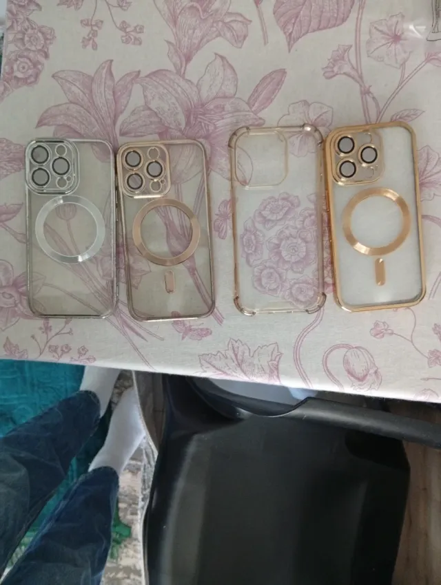 Dettagli del prodottoSet di quattro custodie trasparenti per iPhone 13 Pro. - Design con bordo dorato. - Protezione per la fotocamera. - Anello magnetico integrato. La descrizione è stata tradotta automaticamente.