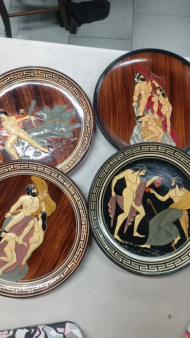 Dettagli del prodottoSet di quattro piatti decorativi in terracotta, ispirati all'arte greca antica.